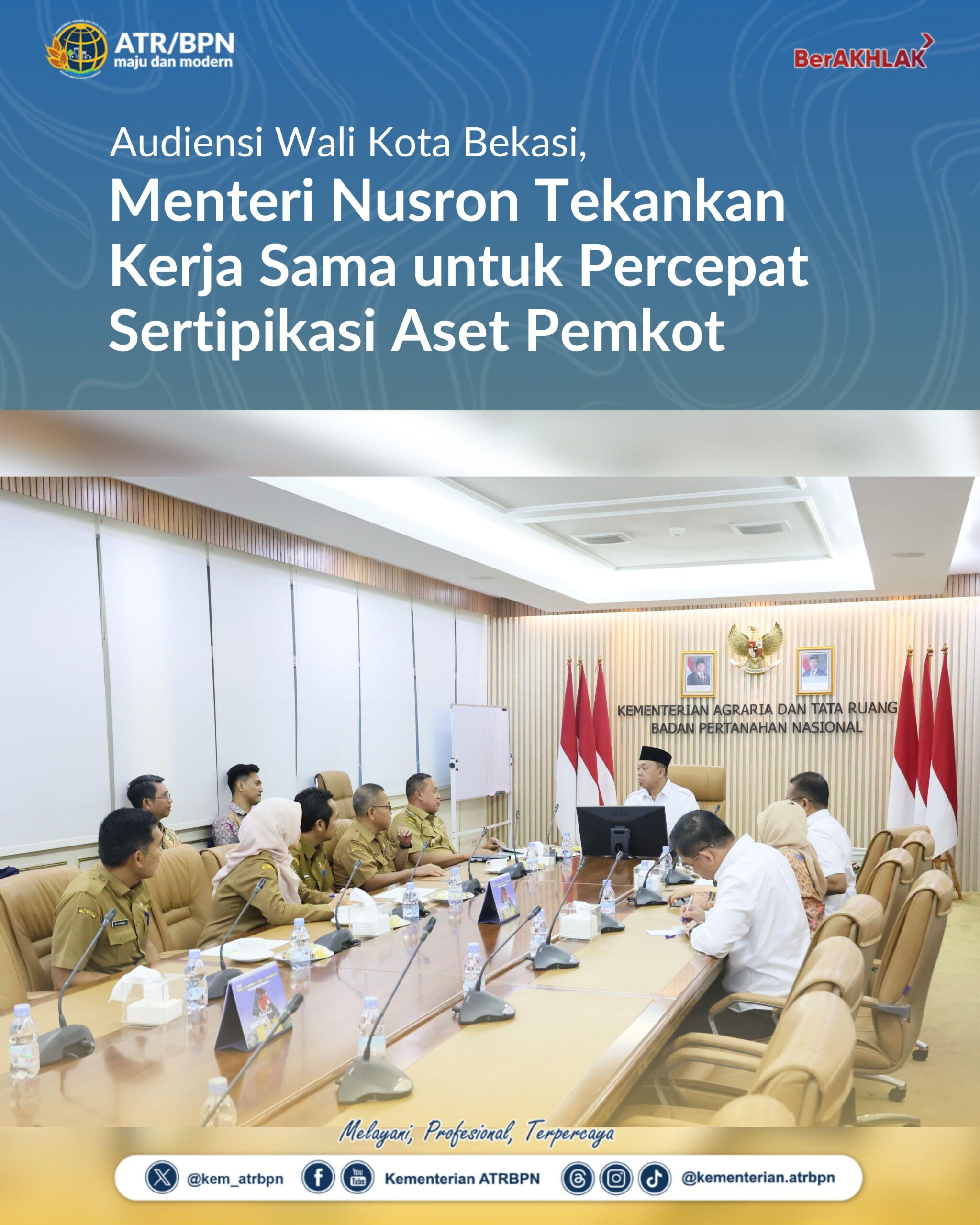 Dutamasyarakatnews.com, – JAKARTA – Menteri Agraria dan Tata Ruang/Kepala Badan Pertanahan Nasional (ATR/BPN), Nusron Wahid, menerima audiensi Wali Kota Bekasi, Tri Adhianto Tjahyono bersama jajarannya pada Selasa (24/06/2025). Dalam pertemuan ini, Menteri Nusron menekankan bahwa percepatan sertipikasi aset milik Pemerintah Kota (Pemkot) Bekasi dapat terlaksana bila terjalin kerja sama aktif dari kedua pihak.