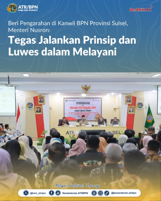 “Kita harus tegas dalam prinsip, tapi luwes dalam pelayanan. Prinsipnya semua bisa dilayani, tapi jalannya jangan kaku hanya karena standar operasional prosedur (SOP). Cari jalan, asal tetap dalam koridor aturan,” tegas Menteri Nusron di hadapan pegawai Kanwil BPN Provinsi Sulsel.