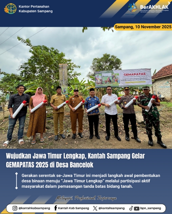 Dutamasyarakatnews.com, – SAMPANG – Kantor Pertanahan (Kantah) Kabupaten Sampang resmi memulai Gerakan Masyarakat Pemasangan Tanda Batas (GEMAPATAS) 2025 di Desa Bancelok, Kecamatan Jrengik, Senin (10/11/2025). Kegiatan ini merupakan bagian dari gerakan serentak se-Provinsi Jawa Timur untuk mewujudkan tertib administrasi pertanahan.
