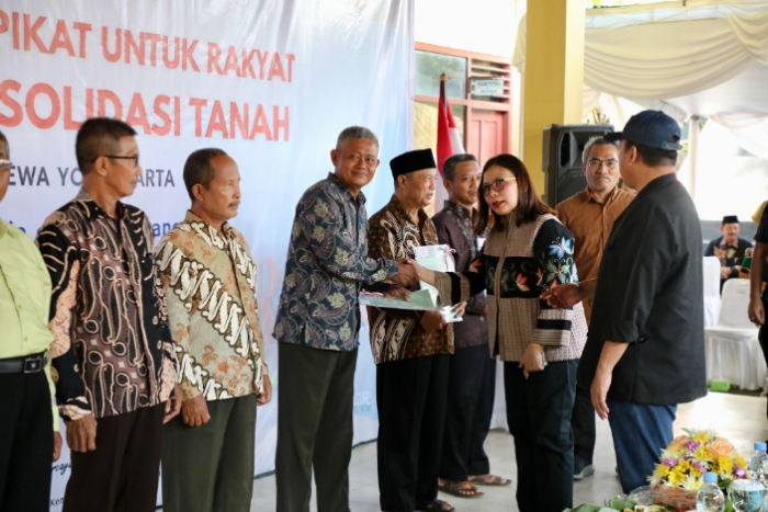 Turut mendampingi Menteri Nusron dalam penyerahan sertipikat ini, Staf Khusus Bidang Komunikasi Strategis dan Kerja Sama Antarlembaga, Muda Saleh; Kepala Biro Hubungan Masyarakat, Harison Mocodompis; Direktur Konsolidasi Tanah dan Pengembangan Pertanahan, Trias Wiriahadi; serta Kepala Kantor Wilayah BPN Provinsi D.I. Yogyakarta, Dony Erwan Brilianto beserta jajaran. (AR/RT/F-R)