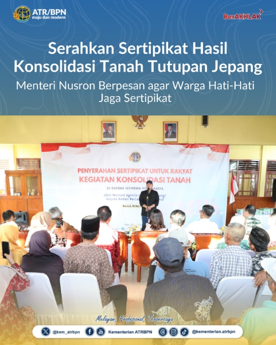 Dalam kesempatan tersebut, Menteri Nusron menyerahkan sebanyak 811 sertipikat hasil Konsolidasi Tanah untuk tanah tutupan Jepang. Tanah tutupan Jepang itu sendiri adalah sebutan bagi tanah masyarakat yang dirampas oleh pihak Jepang saat masa penjajahan di tahun 1943-1945 untuk kebutuhan pertahanan Jepang kala itu.