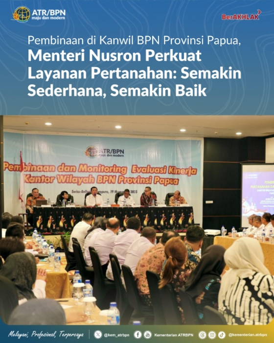 Menteri Agraria dan Tata Ruang/Kepala Badan Pertanahan Nasional (ATR/BPN), Nusron Wahid, mendorong jajaran Kantor Wilayah (Kanwil) BPN Provinsi Papua untuk terus menguatkan kualitas pelayanan pertanahan.
