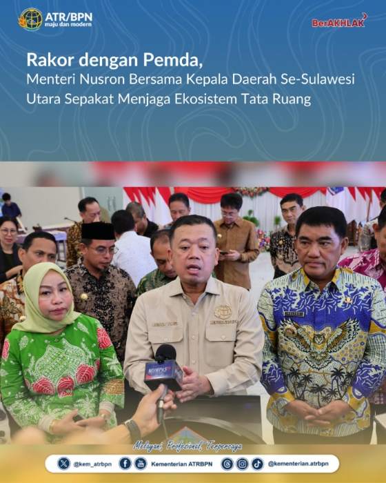 “Kita sepakat untuk sama-sama tanggung jawab dalam rangka menjaga ekosistem tata ruang ini,” ujar Menteri Nusron usai Rakor yang membahas isu strategis terkait pertanahan dan penataan ruang di Sulawesi Utara.