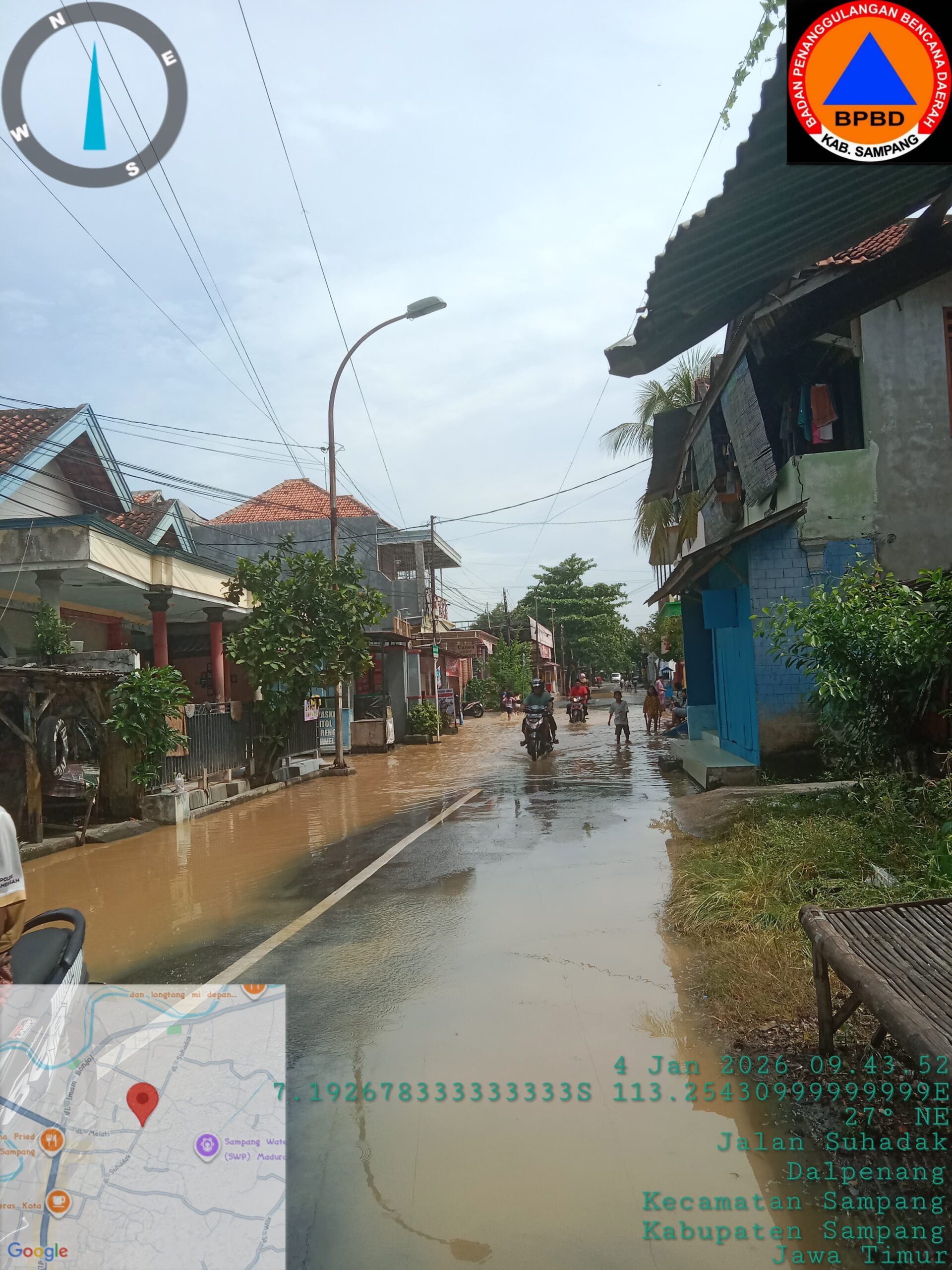 Hujan lebat dengan intensitas tinggi yang mengguyur wilayah Hulu, tepatnya di Kecamatan Karang Penang dan Robatal pada hari Sabtu (03/01/2026), menyebabkan sungai kamuning meluap dan menggenangi beberapa Desa dan ruas jalan utama di kota Sampang.