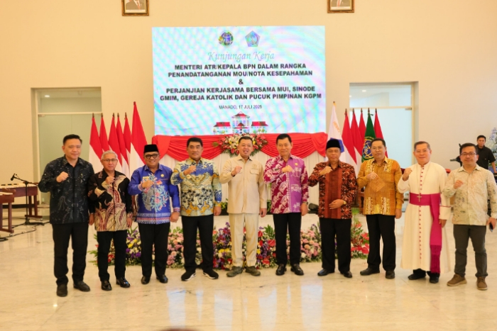 Dutamasyarakatnews.com, – MANADO – Menteri Agraria dan Tata Ruang/Kepala Badan Pertanahan Nasional (ATR/BPN), Nusron Wahid, menyerahkan sejumlah sertipikat tanah kepada pemerintah daerah (Pemda) dan lembaga keagamaan di Sulawesi Utara (Sulut), Kamis (17/07/2025). Dalam kesempatan tersebut, ia menegaskan komitmen pemerintah untuk menyelesaikan pekerjaan rumah (PR) di sektor pertanahan, khususnya dalam masa pemerintahan Presiden Prabowo.